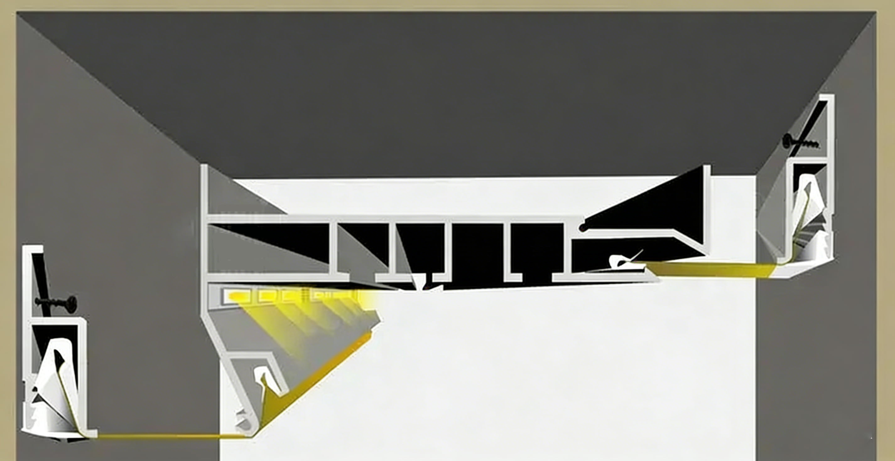 SGC01 is equipped with a harpoon installation system that can integrate eaves into PVC and fabric stretched ceilings. What's even more considerate is that this SGC01 stretched ceiling aluminum profile comes with a light card slot, which can be directly embedded with LED light strips. The built-in diffuser can directly shine light downwards onto the curtains. It can adapt to all types of stretch ceilings, with worry free installation and exquisite effects, making it the first choice for most households.The installation position of the concealed curtain rod should be kept at an appropriate distance from the wall where the window is located. The distance usually depends on the overhang length of the window sill, the position of the radiator, and the fluffiness of the curtains. The purpose of calculating this distance is to ensure that the curtains do not touch the window sill or radiator.