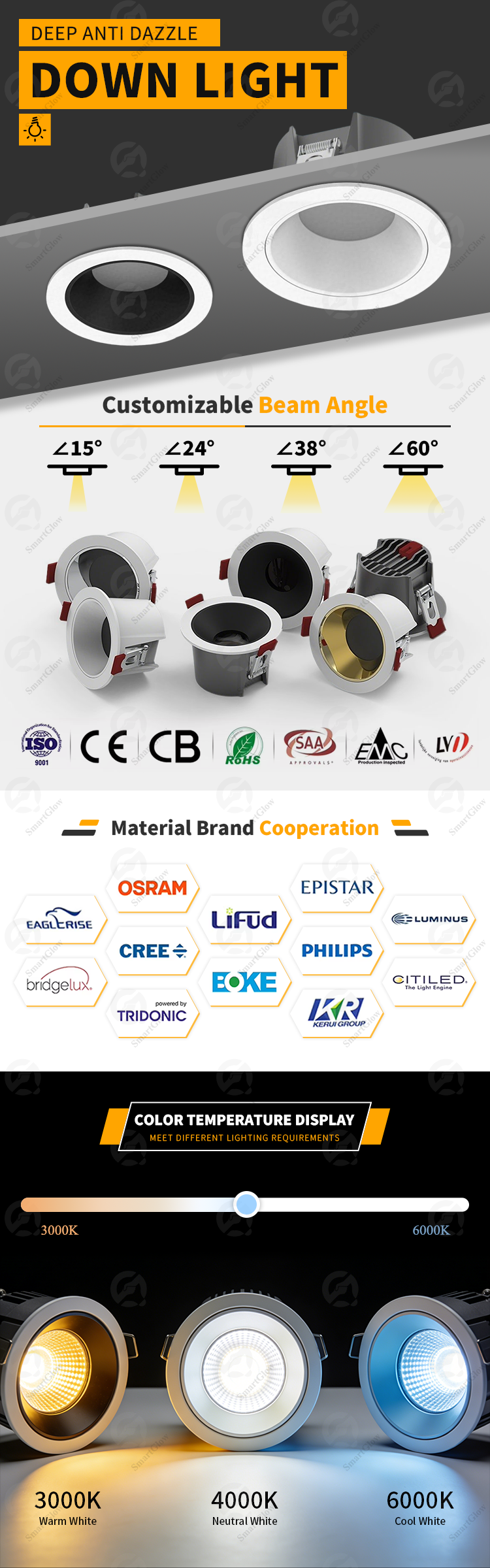 Circular embedded ceiling LED tube light, suitable for various application scenarios. The beam angle can be adjusted between 15-60 degrees, making it very suitable for spotlight illumination. Product Features: Connect to the intelligent control system, supporting Tuya, WiFi, Bluetooth Zigbee Aluminum radiator enhances reliability Shining low glare multi-faceted lens The latest generation of COB LED chips - Osram, Cree, Bridgelux 5-year warranty.