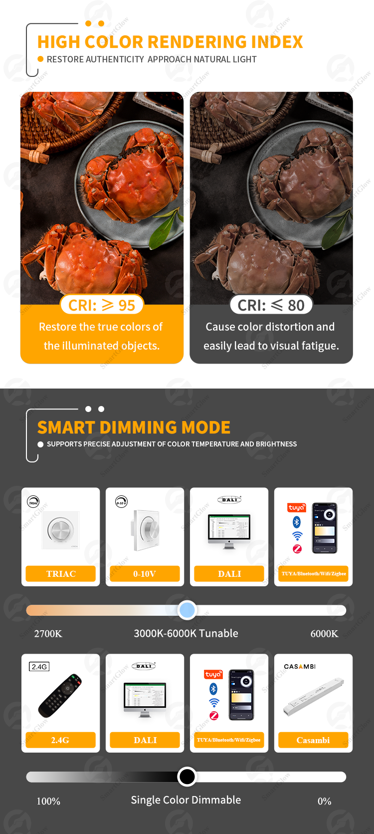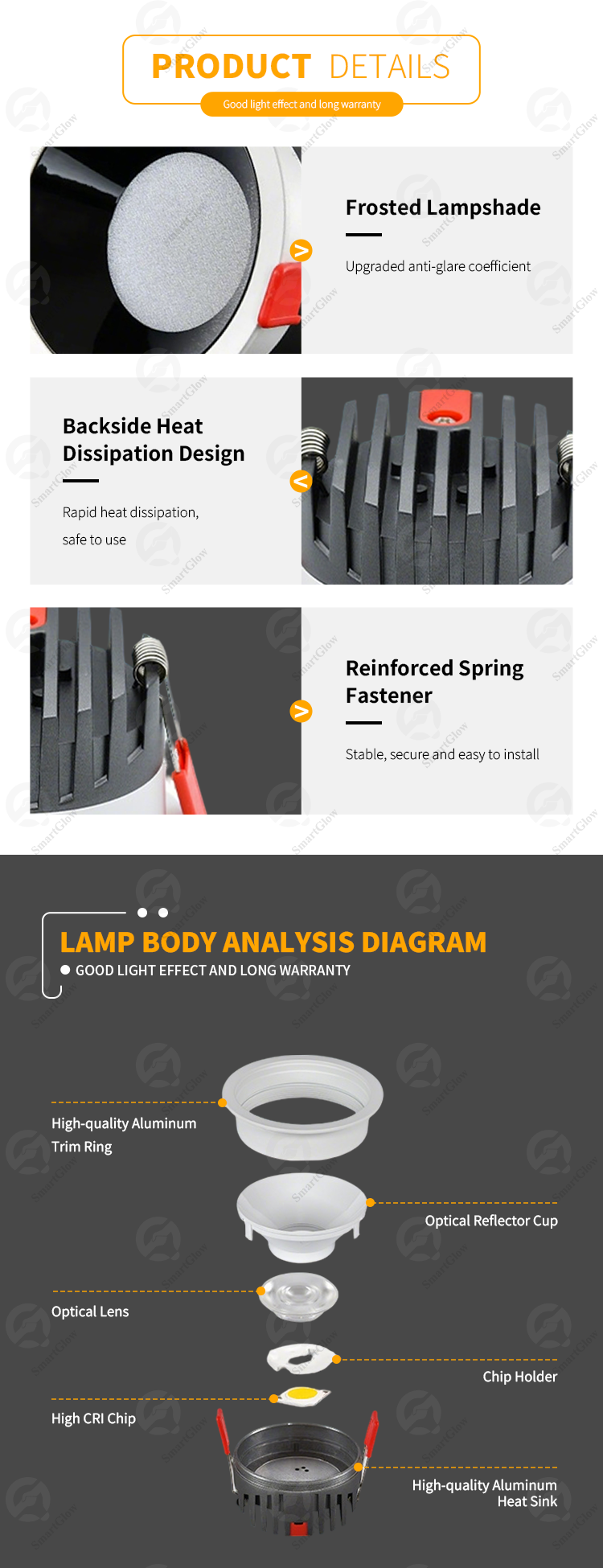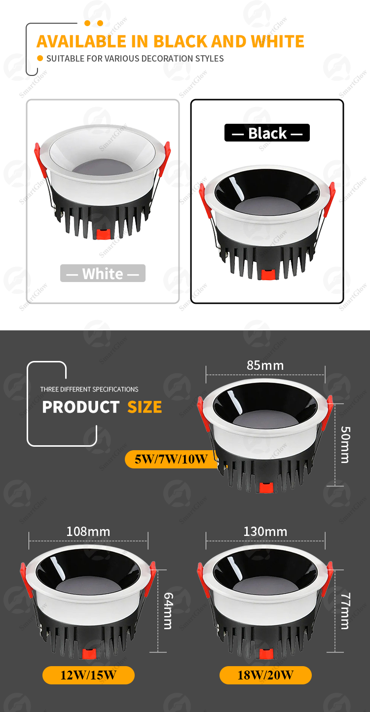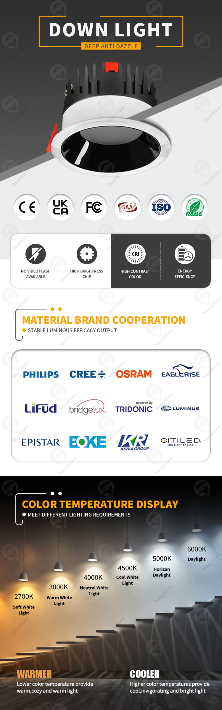 Standard lamp body colors: black, white. Material: The lighting fixtures are made of aluminum material. The lighting fixtures can be installed in gypsum boards or ceilings, and the reflectors are made of high-quality aluminum and tempered glass. The lighting fixtures use the latest generation of SMD LED chips - Osram, Cree, Bridgelux. Even within the warranty period of the LED module, the attenuation of luminous flux is minimal, not exceeding 10%. Optional color temperature: 3000K/4000K/5000K, chips below 3000K can also be installed according to requirements. Luminous flux: 1800 to 2500 lumens. Color rendering index: 80/90. LED chip lifespan: 50000 hours.