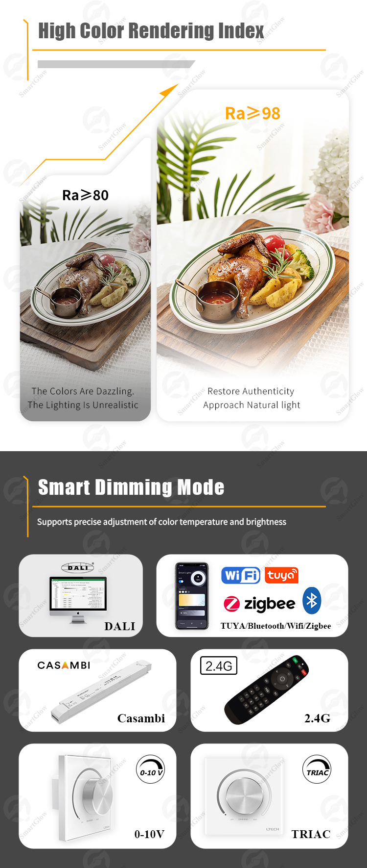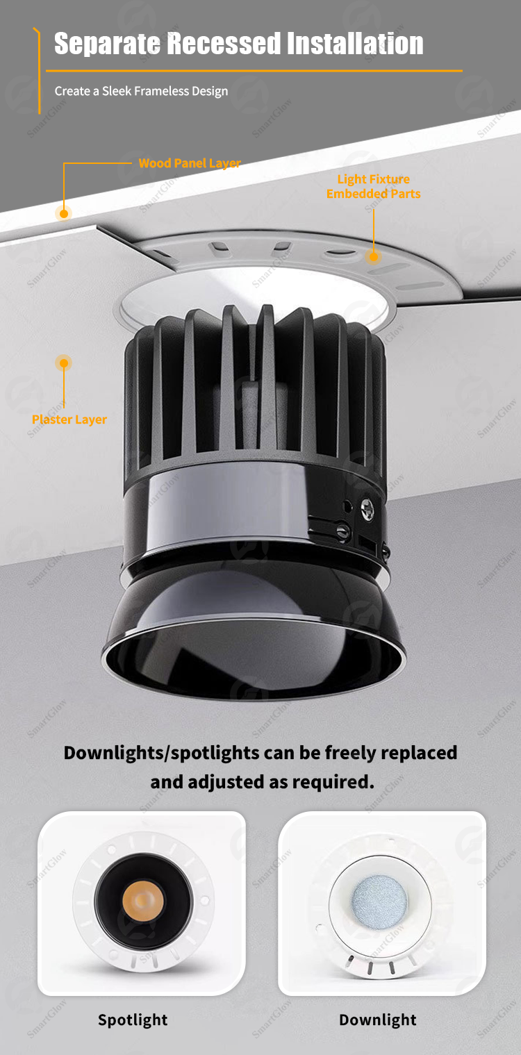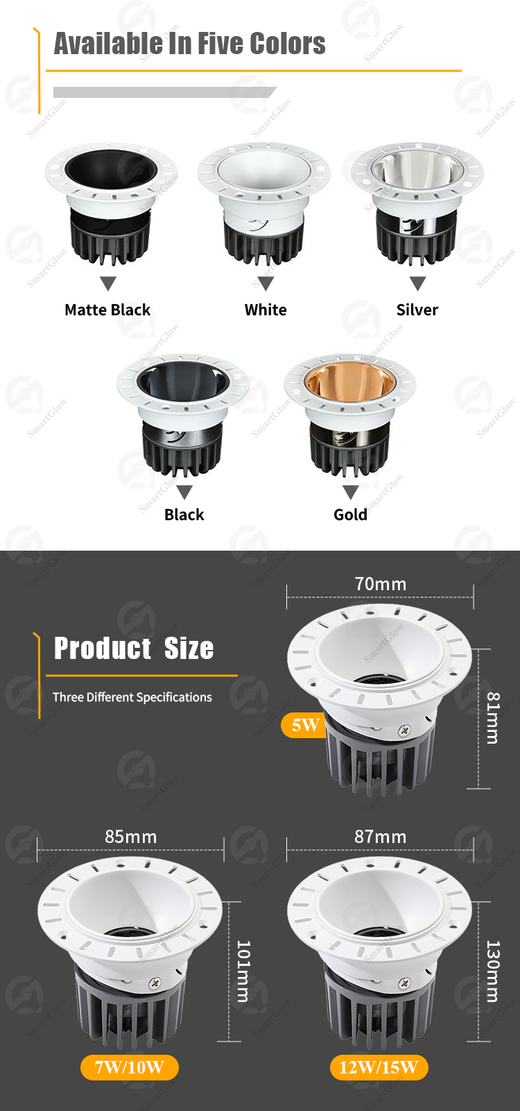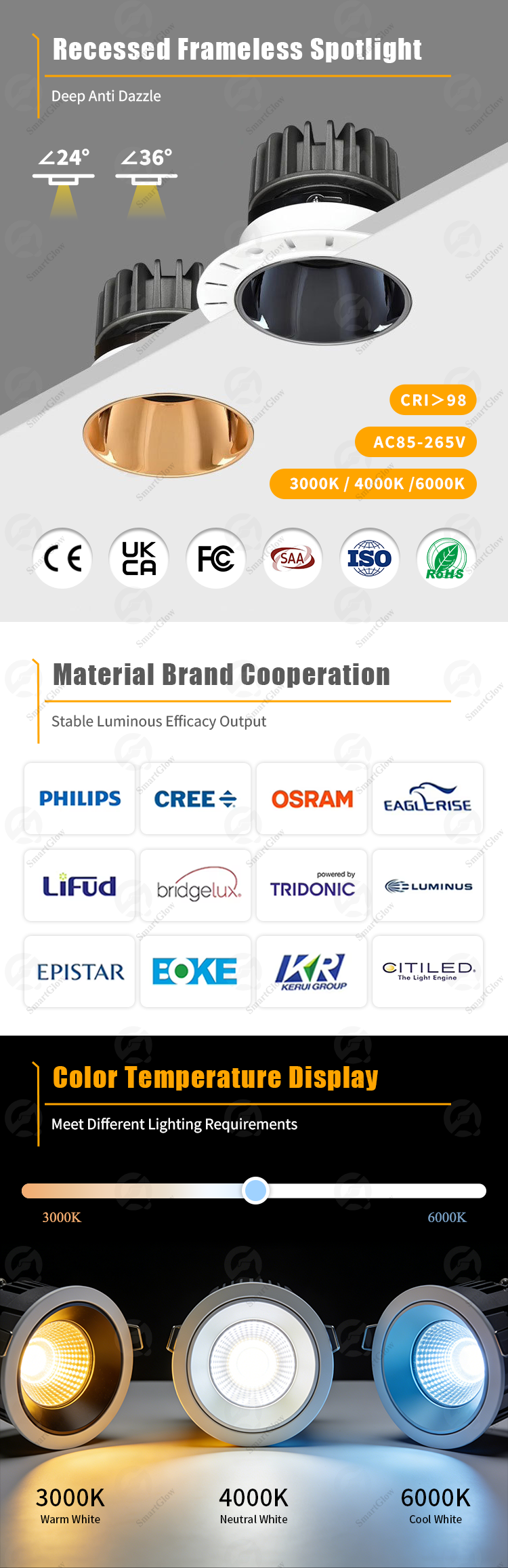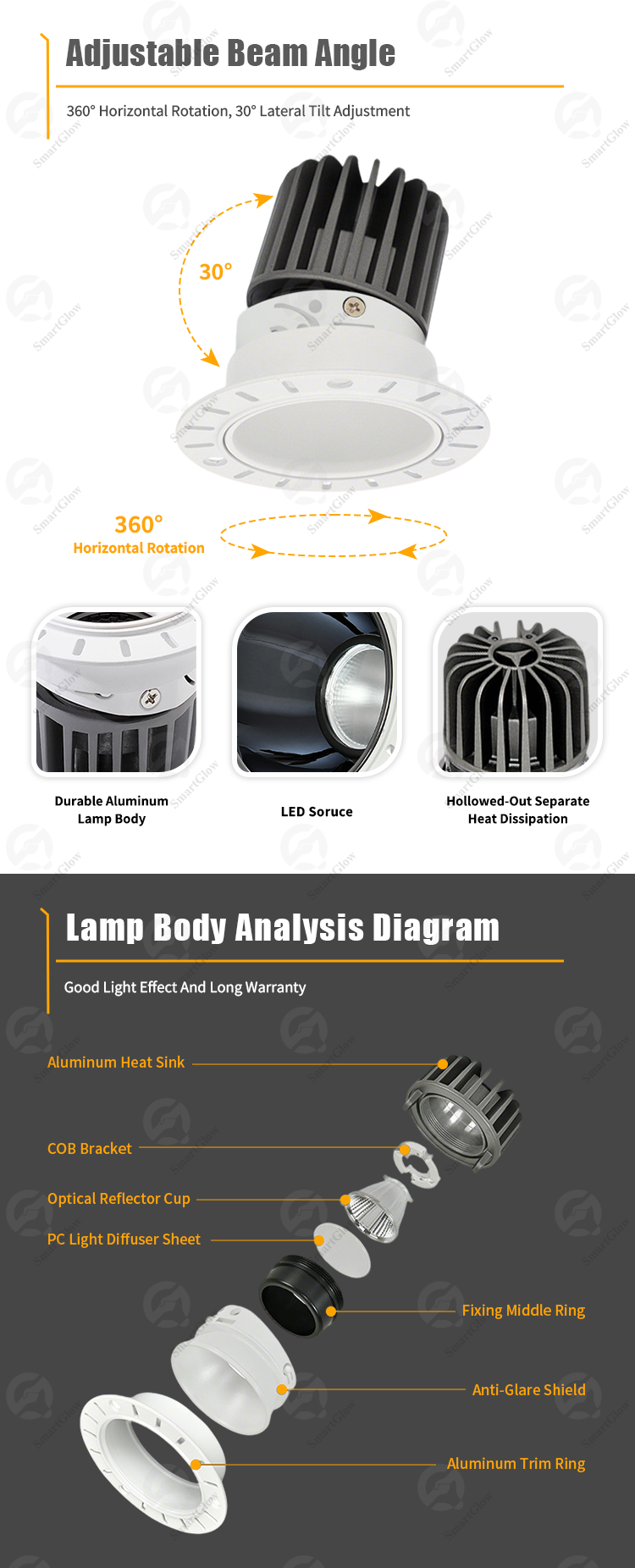 This LED spotlight supports horizontal 360 ° and vertical 30 ° beam angle adjustment, which can accurately project light onto the target object. The lamp adopts COB light source, with a luminous efficiency of up to 110lm/W and a color rendering index CRI. Ra>90. It also supports bidirectional thyristor dimming (compatible with rear edge dimmer) and offers three color temperatures of 3000K, 4000K, and 6000K, which can adapt to various decorative style requirements. The product has a service life of over 50000 hours and meets IP65 protection level, and can be used in various places such as kitchens, bathrooms, corridors, etc.