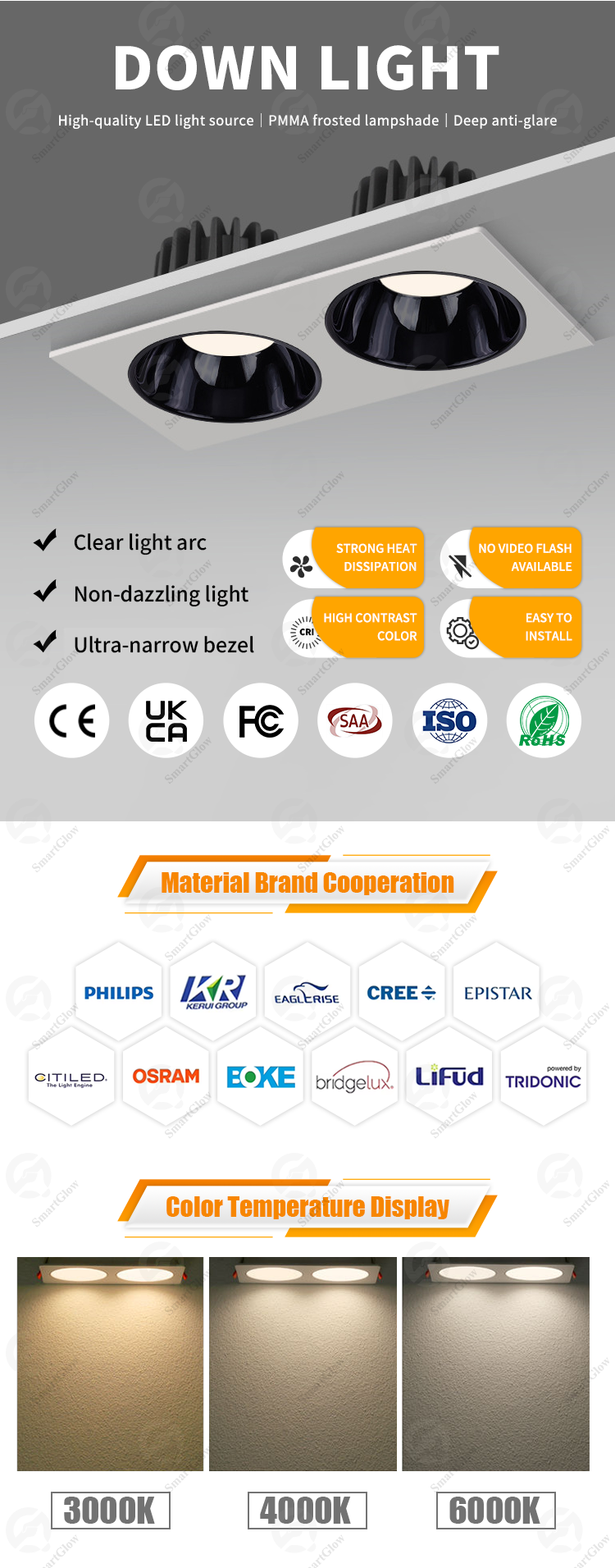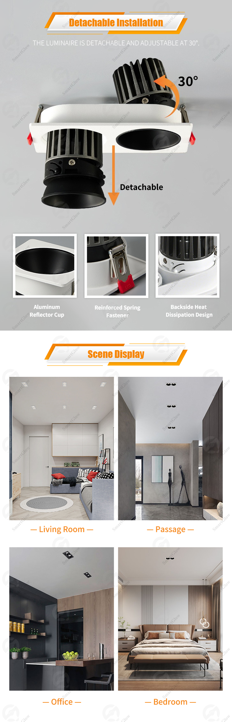 This LED spotlight can be disassembled and installed, with a vertical beam angle adjustment of 30 °, which can accurately project light onto the target object. The product has a service life of over 50000 hours and meets IP65 protection level, and can be used in various places such as kitchens, bathrooms, corridors, etc. Certified by CE/UKCA/ROHS. Factory direct sales, providing OEM/ODM customization services.